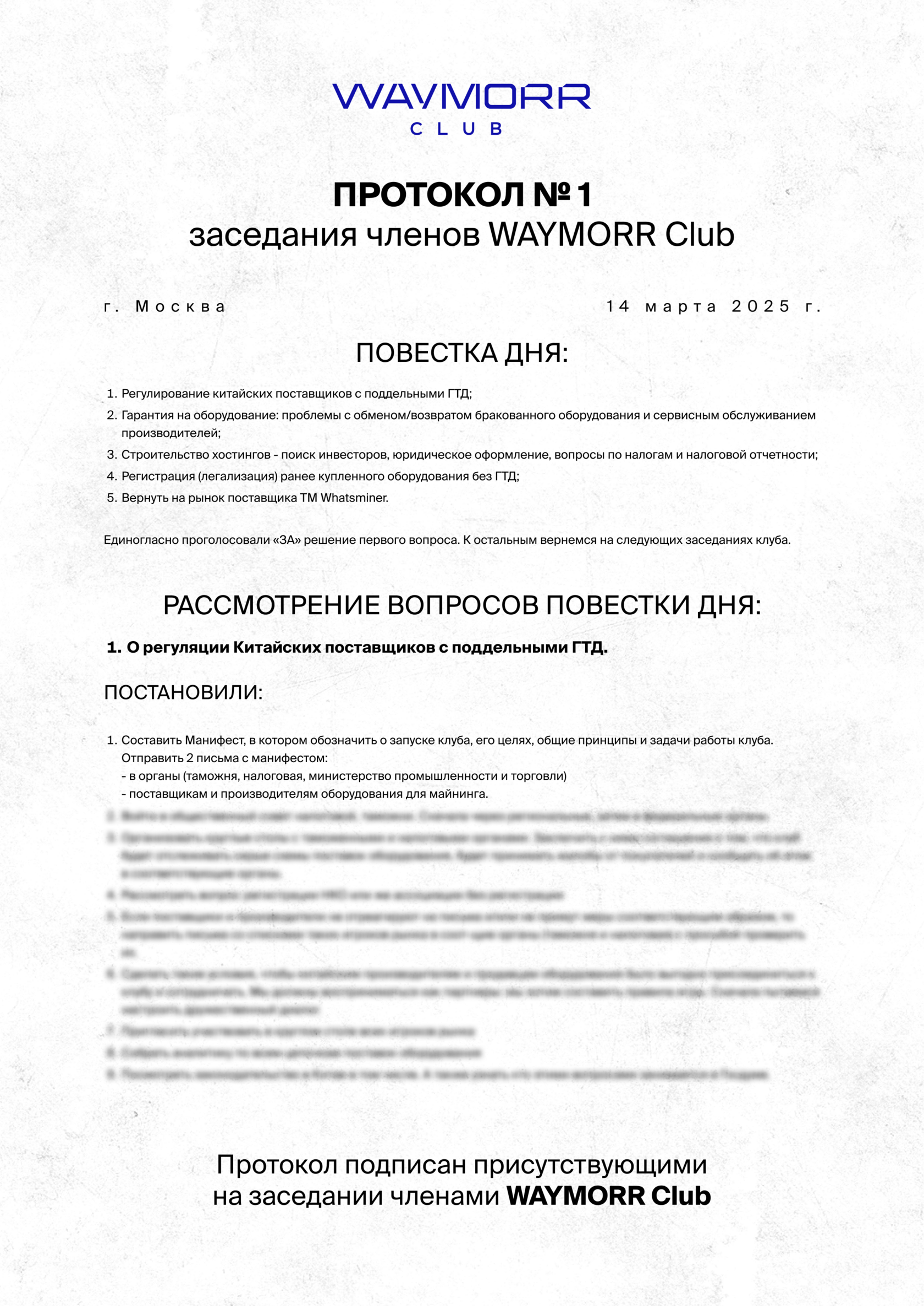 Состоялось первое заседание членов WAYMORR Club — закрытого профессионального сообщества для участников майнинговой отрасли. Новый формат взаимодействия объединил ключевых игроков рынка с целью системной работы по оздоровлению отрасли, выстраиванию конструктивного диалога с государством и созданию прозрачных правил игры.